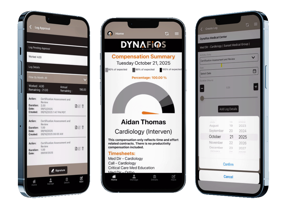 Many healthcare organizations utilize time and effort-related arrangements with providers for administrative and call-related services. As part of our provider compensation management platform, Dynafios’ physician software solutions provide users with a simple way to capture time, approve time sheets, and get providers paid quickly.